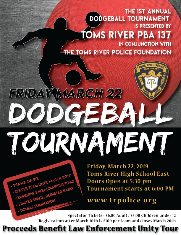 Join us for the PBA 137’s 1st Annual Dodgeball Tournament on Friday, March 22nd! For details and to register please https://www.tomsriverpolicefoundation.org